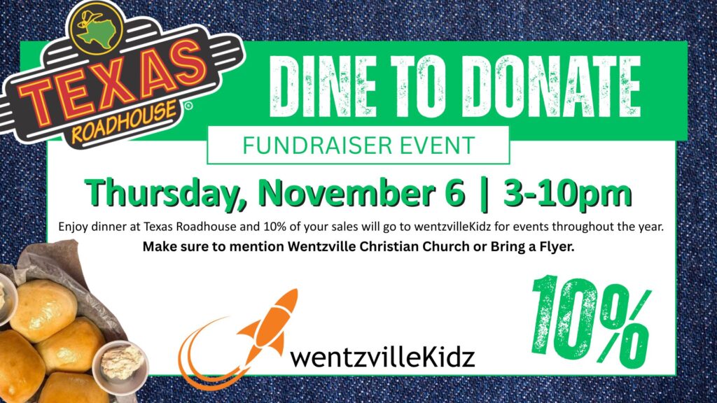 Enjoy dinner at Texas Roadhouse on Thursday, November 6 and 10% of your sales will go toward future events at wentzvilleKidz. Make sure to mention Wentzville Christian Church or Bring a Flyer (available at WCC).
