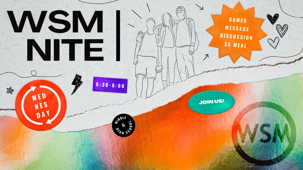 Middle and high school students, WSM Nite starts back up this September! Enjoy a meal, lesson, and small group discussion time with students 6th-12th grade. If you choose to eat with us at 6:30, please bring $5 and follow us on Instagram to stay updated on what each week’s meal will be.
